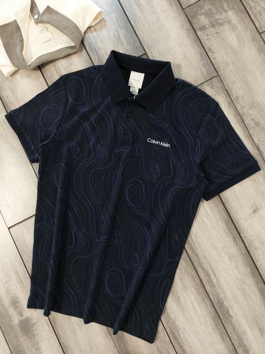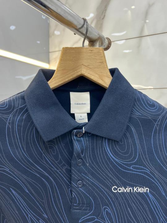 Calvin Klei n Navy Premium Imported Compact Yarn 240 GSM Interlock Fabric Polo Tshirt with All over Design and Emboss Logo 3926
