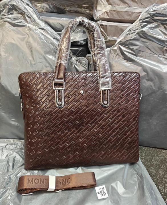 Mont Blanc Embossed Monogram Leather Laptop Bag With Strap Coffee (M-1064-1)