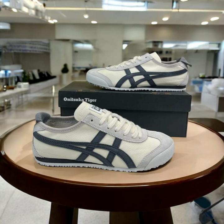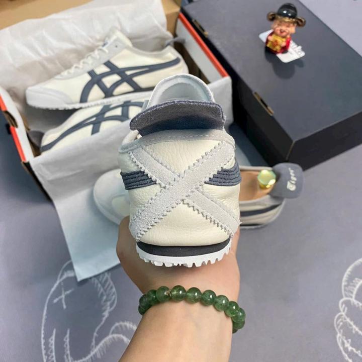 The Onitsuka Tiger Mexico 66 in "Beige/Navy" (often referred to as Birch/India Ink) is one of the most popular understated colorways in the 2026 lineup. It features a warm, sandy "Beige" or "Birch" leather base accented by deep "India Ink" (Navy) Tiger stripes. This 7A Premium Quality edition is highly favored for its ability to look "vintage-fresh" while providing a more subtle alternative to the high-contrast White/Black models.