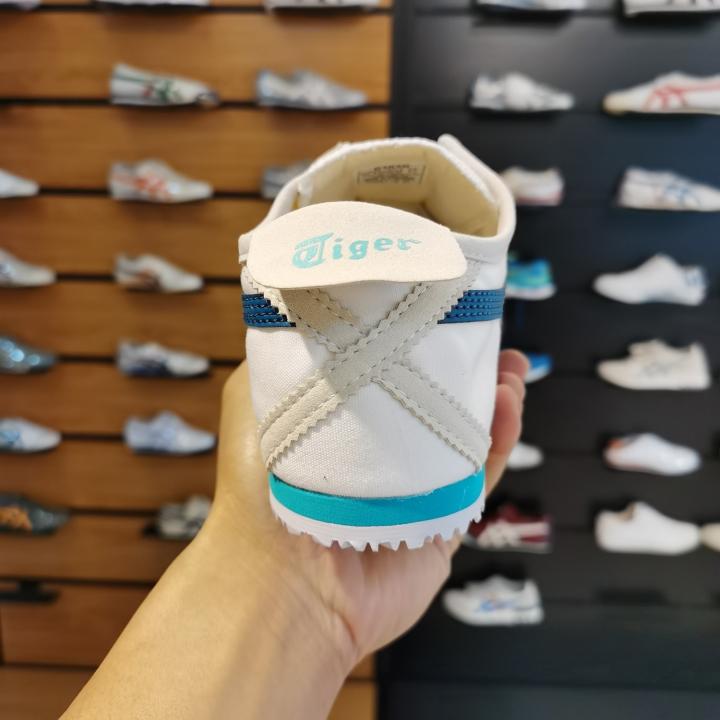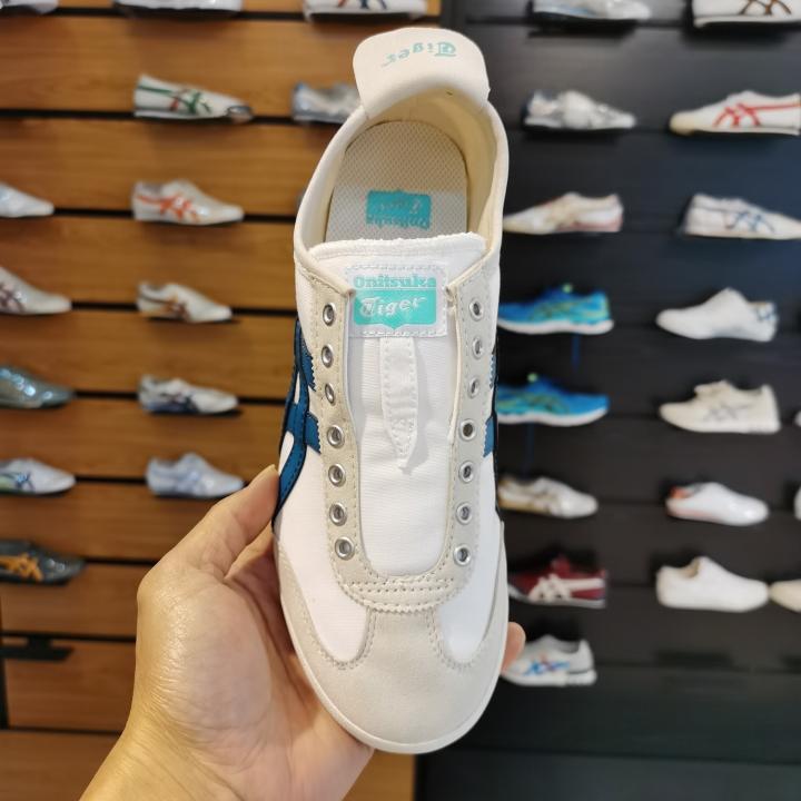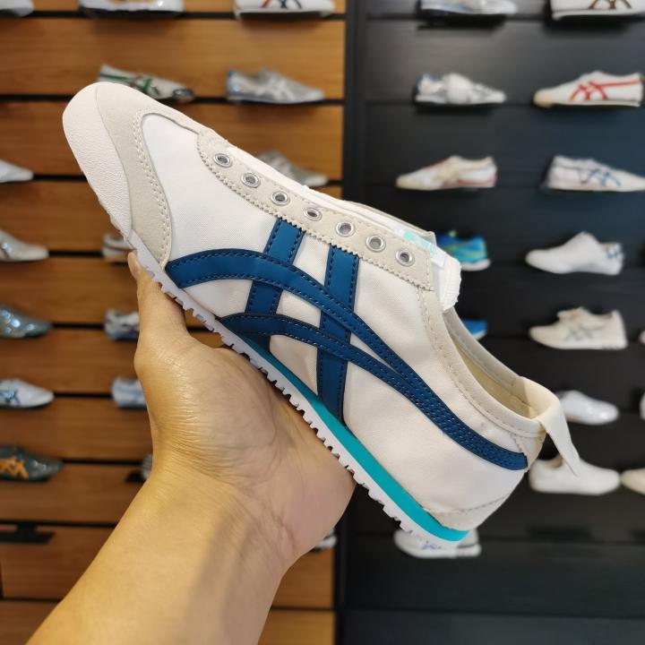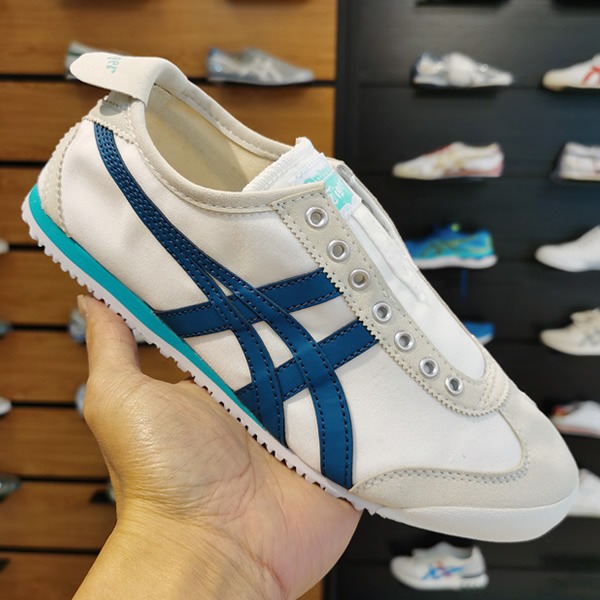 The Onitsuka Tiger Mexico 66 Slip-On in "White/Lake Blue" is a refreshed, breezy take on the iconic 1966 silhouette. This colorway features a crisp white canvas or synthetic leather base accented by "Lake Blue" Tiger stripes?a shade that is slightly lighter and more vibrant than standard Navy, giving it a distinct Mediterranean or coastal vibe. This 7A Premium Quality edition perfectly balances the shoe's athletic heritage with a modern, laceless convenience.