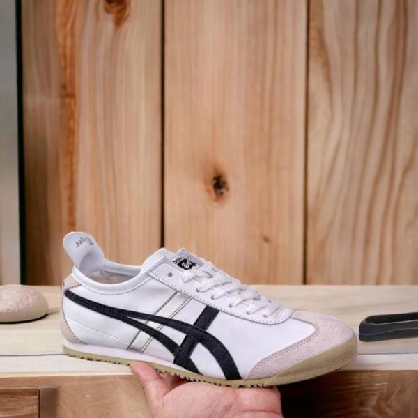 The Onitsuka Tiger Mexico 66 in "White/Black/Silver" is a contemporary spin on the classic track silhouette. This edition takes the timeless white leather base and elevates it with high-contrast black Tiger stripes, but adds a futuristic touch with Metallic Silver accents?usually featured on the heel cross-stitching, the branded heel flap, or as a dual-tone stripe detail. This 7A Premium Quality version is perfect for those who want a monochrome look with a subtle metallic edge that catches the light.